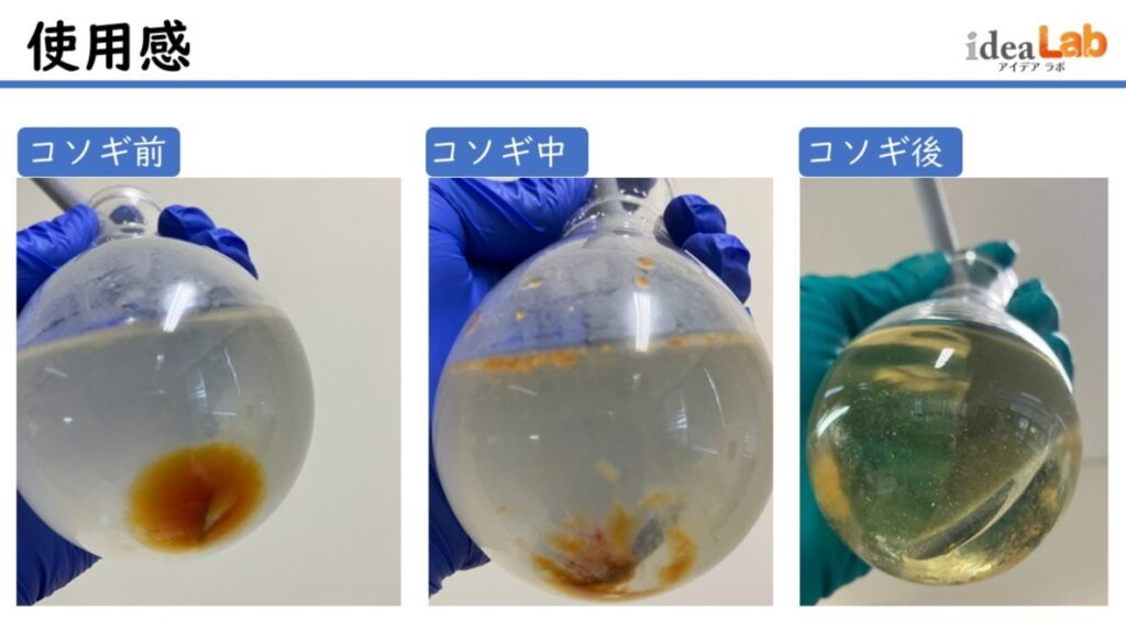 「フラスコ上部もこそぎたいが、口で引っかかる」との声を受け、先端の長さを短く調整。
