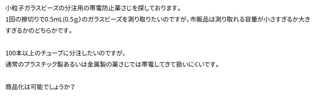 小粒子のガラスビーズを分注するための薬さじがほしいとのお悩み。